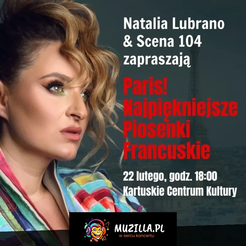 Muzyczne wędrówki paryskimi uliczkami nie mogłyby się odbyć bez ponadczasowych, poetyckich kompozycji, na których wychowało się już kilka pokoleń entuzjastów francuskiej muzyki. Wśród znanych szerokiej publiczności utworów, usłyszymy najpiękniejsze piosenki takich artystów jak: Edith Piaf, Charles Aznavour, Enzo Enzo, Joe Dassin, ZAZ czy Claude François. Program Natalii Lubrano z akompaniamentem Sceny 104 stanowi ukłon w stronę największych nazwisk tworzących obraz francuskiej muzyki. Tego wieczoru z pewnością nie zabraknie czułych emocji i wzruszeń, a powrót do kultowych utworów znad Sekwany, zachęci nas do chwili uśmiechu czy wspaniałych wspomnień.