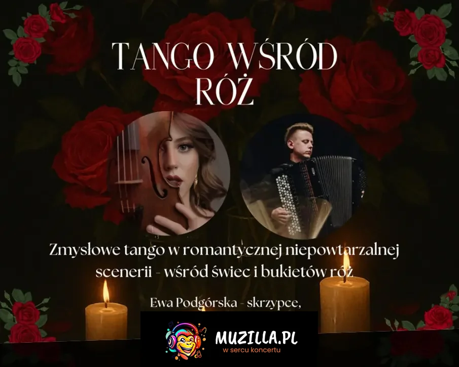 "Tango wśród róż" to nastrojowy, kameralny koncert w formie recitalu na skrzypce i akordeon, osadzony w wyjątkowej scenografii - wśród świec i bukietów róż. Tango w swojej naturze jest muzyką niezwykle emocjonalną - łączy tęsknotę z namiętnością, melancholię z dramatem i porywającą energią. Duet skrzypiec i akordeonu tworzy wyjątkowe, głębokie połączenie brzmieniowe, które jeszcze mocniej podkreśla intensywność i charakter tej muzyki. To nie jest zwykły koncert - to zmysłowe, muzyczne doświadczenie.
