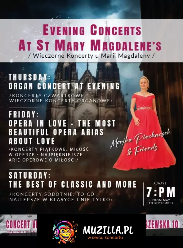 Wnętrze świątyni - chłodne kamienne filary, strzeliste sklepienia i znakomita akustyka - tworzy idealną scenę dla muzyki klasycznej. Każdy wieczór przynosi inny program: wokalne i instrumentalne arcydzieła, wykonywane przez artystów o różnorodnych temperamentach, barwach głosu i muzycznych wrażliwościach. Dzięki temu każdy koncert staje się osobną opowieścią, a cały cykl - kalejdoskopem stylów, epok i emocji. W wybrane dni publiczność może zanurzyć się w koncertach tematycznych, które przenoszą słuchaczy w jeszcze inne wymiary muzyki. To wieczory, które szczególnie zapadają w pamięć. Najświeższe zapowiedzi, zmiany repertuaru i wyjątkowe wydarzenia specjalne można znaleźć na naszym profilu na Facebooku, gdzie regularnie publikujemy aktualności i muzyczne inspiracje.