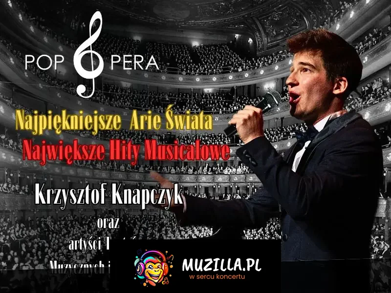 Zapraszamy na muzyczne widowisko, które zabierze Państwa w niezwykłą podróż - od wzruszających arii operowych, przez porywające hity musicalowe, aż po kultowe utwory muzyki rozrywkowej. Pop Opera - Od Opery do Musicalu to wydarzenie, które za każdym razem zaskakuje czymś nowym. Muzyka połączy pokolenia. Najpiękniejsze arie operowe i ponadczasowe przeboje musicalowe w mistrzowskim wykonaniu solistów Teatrów Muzycznych i Operowych. Na scenie pojawią się artyści, którzy oczarowali publiczność na światowych scenach - w tym tenor Krzysztof Knapczyk, znany z niezwykłej ekspresji i głosu, który zapada w pamięć.