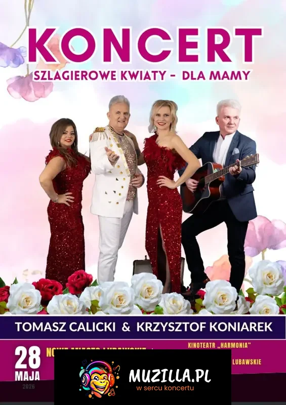 Któż z nas nie kocha swojej Mamy? Z okazji ich święta serdecznie zapraszamy na koncert "Szlagierowe Kwiaty dla Mamy". Czeka nas wieczór pełen emocji, wspaniałej, melodyjnej muzyki, pozytywnej energii i wzruszeń. Nie zabraknie także dobrego humoru, a o to wszystko zadbają artyści znani m.in. z anteny telewizji TVS oraz wielu rozgłośni radiowych : Krzysztof Koniarek z zespołem oraz zwycięzca Plebiscytu Hit Roku 2025 w TVS - Tomasz Calicki z zespołem.