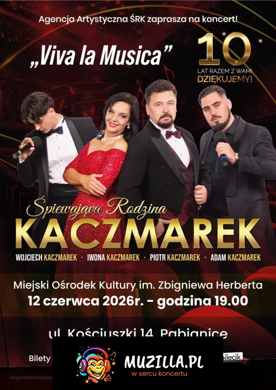 "Viva La Musica" to zupełnie nowy koncert jedynej w Polsce rodziny śpiewającej muzykę klasyczną. W wykonaniu Śpiewającej Rodziny Kaczmarek usłyszycie państwo tym razem najpiękniejsze melodie z operetki min. Wesołej wdówki, Hrabiny Marizy, Księżniczki Czardasza, czy Guditty, przeboje z musicali min: Skrzypka na dachu, My fair lady czy Upiora w operze, a także piękne standardy muzyki rozrywkowej, piosenki z repertuaru Franka Sinatry Elvisa Presleya, Poula Anki czy Luisa Armstronga.