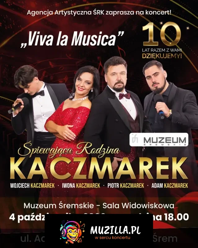"Viva La Musica" to zupełnie nowy koncert jedynej w Polsce rodziny śpiewającej muzykę klasyczną. W wykonaniu Śpiewającej Rodziny Kaczmarek usłyszycie państwo tym razem najpiękniejsze melodie z operetki min. Wesołej wdówki, Hrabiny Marizy, Księżniczki Czardasza, czy Guditty, przeboje z musicali min: Skrzypka na dachu, My fair lady czy Upiora w operze, a także piękne standardy muzyki rozrywkowej, piosenki z repertuaru Franka Sinatry Elvisa Presleya, Poula Anki czy Luisa Armstronga.
