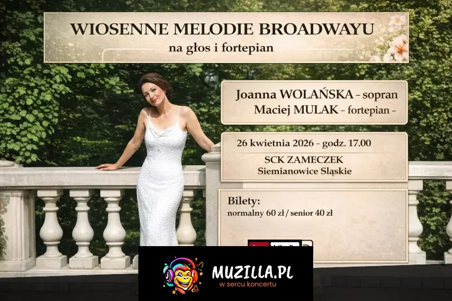 To koncert, w którym liczy się emocja i jakość wykonania. Joanna WOLAŃSKA zachwyca ciepłą barwą głosu i sceniczną dojrzałością, prowadząc publiczność przez najważniejsze momenty musicalowego świata. Przy fortepianie towarzyszyć jej będzie Maciej MULAK, tworząc subtelne, pełne klasy brzmienie, które pozwala wybrzmieć każdemu słowu.