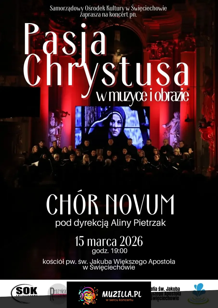 Samorządowy Ośrodek Kultury w Święciechowie zaprasza na wyjątkowe wydarzenie artystyczno-duchowe - jedyne tego rodzaju - łączące potęgę muzyki chóralnej z przejmującym obrazem filmowym. Na scenie wystąpi Chór Novum - zespół ceniony za wysoki poziom artystyczny, niezwykłą wrażliwość interpretacyjną oraz głębię brzmienia. Ich wykonania zachwycają publiczność i nadają każdemu utworowi wyjątkowy, duchowy wymiar. Tego wieczoru śpiew stanie się przestrzenią osobistego spotkania z tajemnicą Męki, Śmierci i Zmartwychwstania Jezusa Chrystusa.