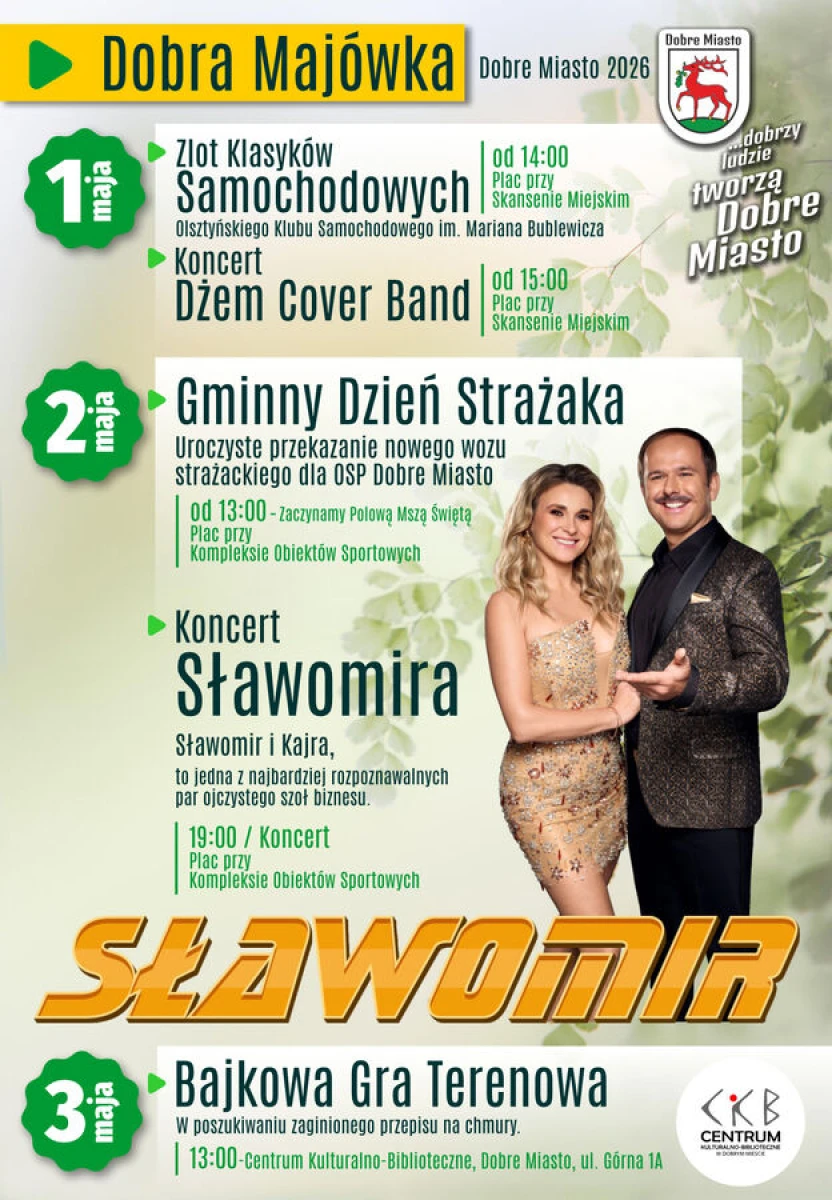 Sławomir to jeden z najbardziej rozpoznawalnych polskich wykonawców muzyki rozrywkowej, kojarzony z energetycznym stylem rock-polo i przebojem „Miłość w Zakopanem”. W Dobrym Mieście wystąpi razem z Kajrą, tworząc koncert nastawiony na wspólne śpiewanie, taniec i majówkową zabawę.