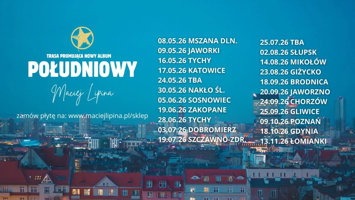 Maciej Lipina rusza w trasę koncertową „Południowy” 2026. Artystę będzie można zobaczyć na żywo w wielu miastach Polski - od Mszany Dolnej i Jaworek, przez Tychy, Katowice, Sosnowiec, Zakopane, Giżycko, Chorzów, Gliwice, Poznań, aż po Gdynię i Łomianki.